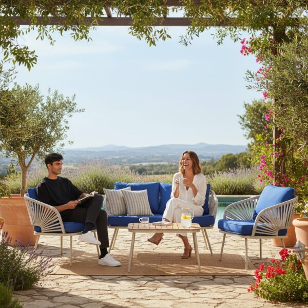 • Habillage des matelas et coussins en toile acrylique imperméable, anti UV, déhoussables et lavables (-40%)